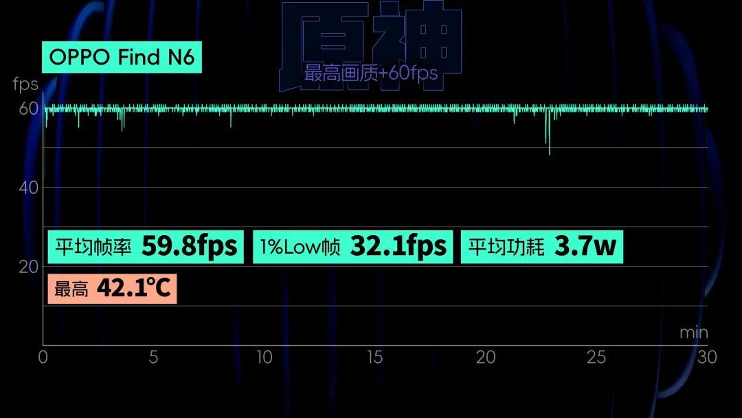 这也要归功于Find N6上这颗第五代骁龙8至尊版解决器的功耗进展,按照常规咱们也测试了Find N6的游戏性能进展,在最高画质的原神3.0跑图测试中,Find N6平均帧率59.8,1% Low帧32.1,功耗3.7瓦,机身最高42.1度;负载更高的星铁黄金的时刻30分钟跑图,平均帧率58.5,1% Low帧30.1,功耗4.98瓦,机身最高45.3度,相较传统直板机,两款游戏的帧率进展也涓滴不忘形。